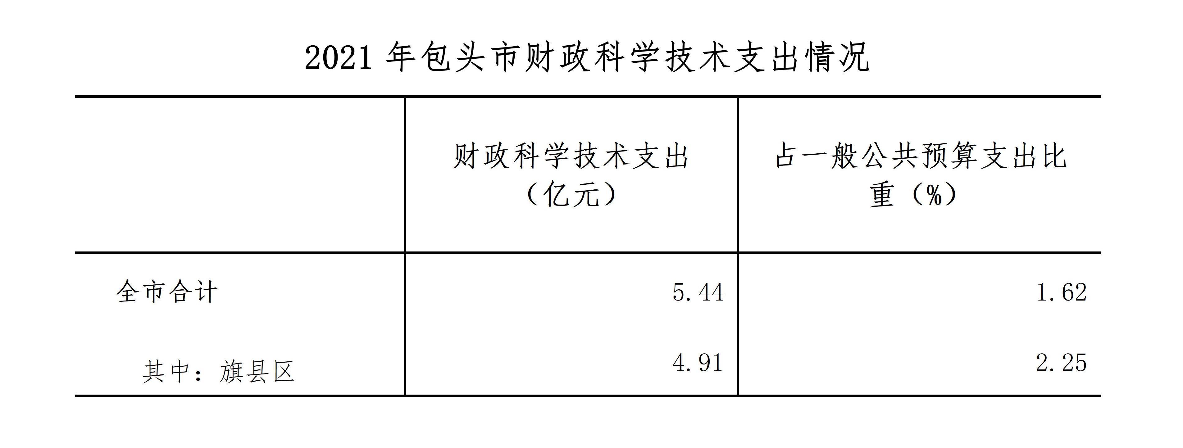 2021年,包头市财政科学技术支出5.44亿元,比上年增加1.28亿元,同口径增长30.74%,占一般公共预算支出的比重为1.62%。各旗县区合计财政科学技术支出4.91亿元,占一般公共预算支出比重为2.25%。