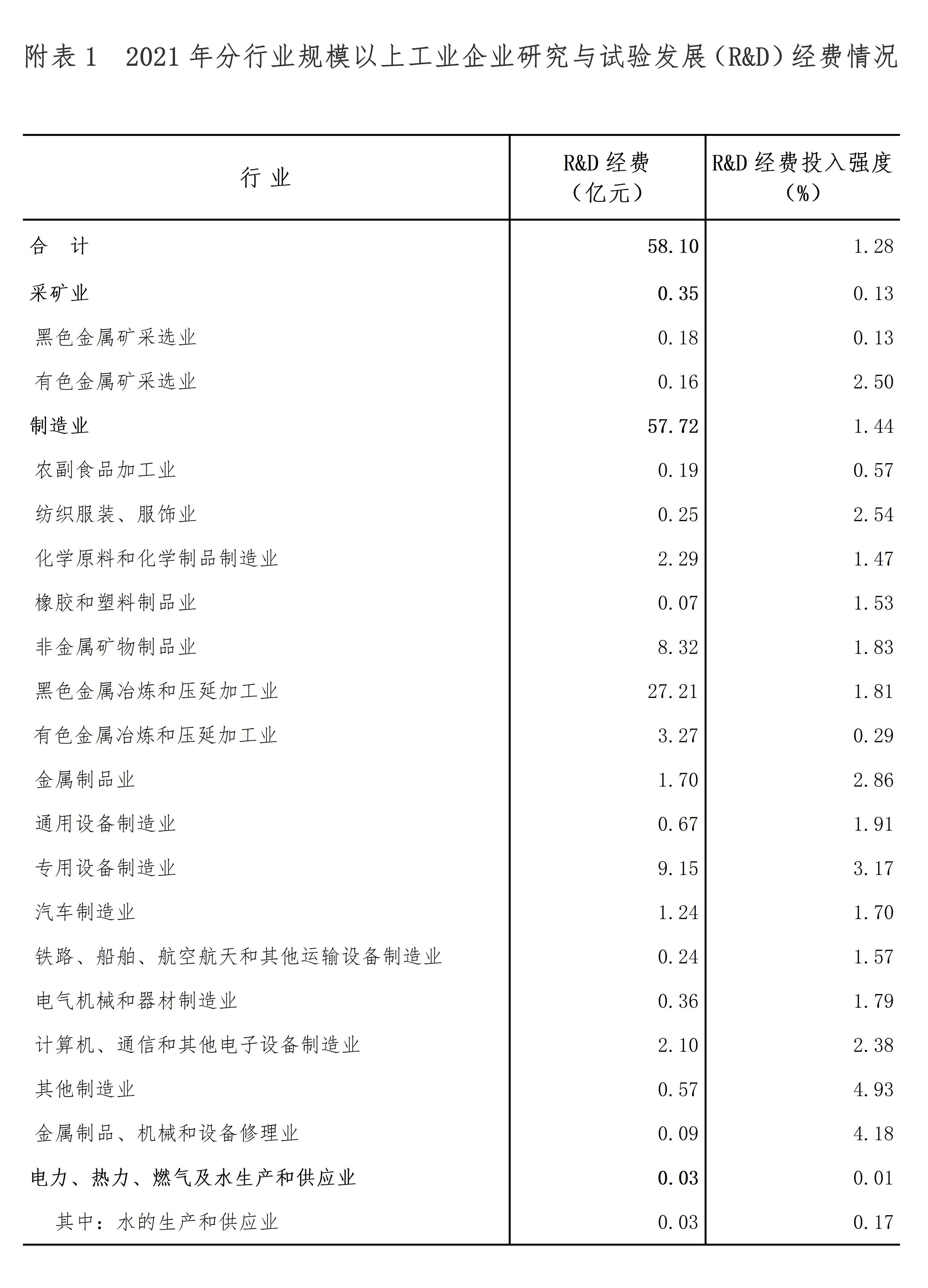 分行业看,在规模以上工业企业[4]中,研究与试验发展(R&D)经费投入超过亿元的行业大类有8个,这8个行业的经费占全部规模以上工业企业研究与试验发展(R&D)经费的比重为95.1%(详见附表1)。