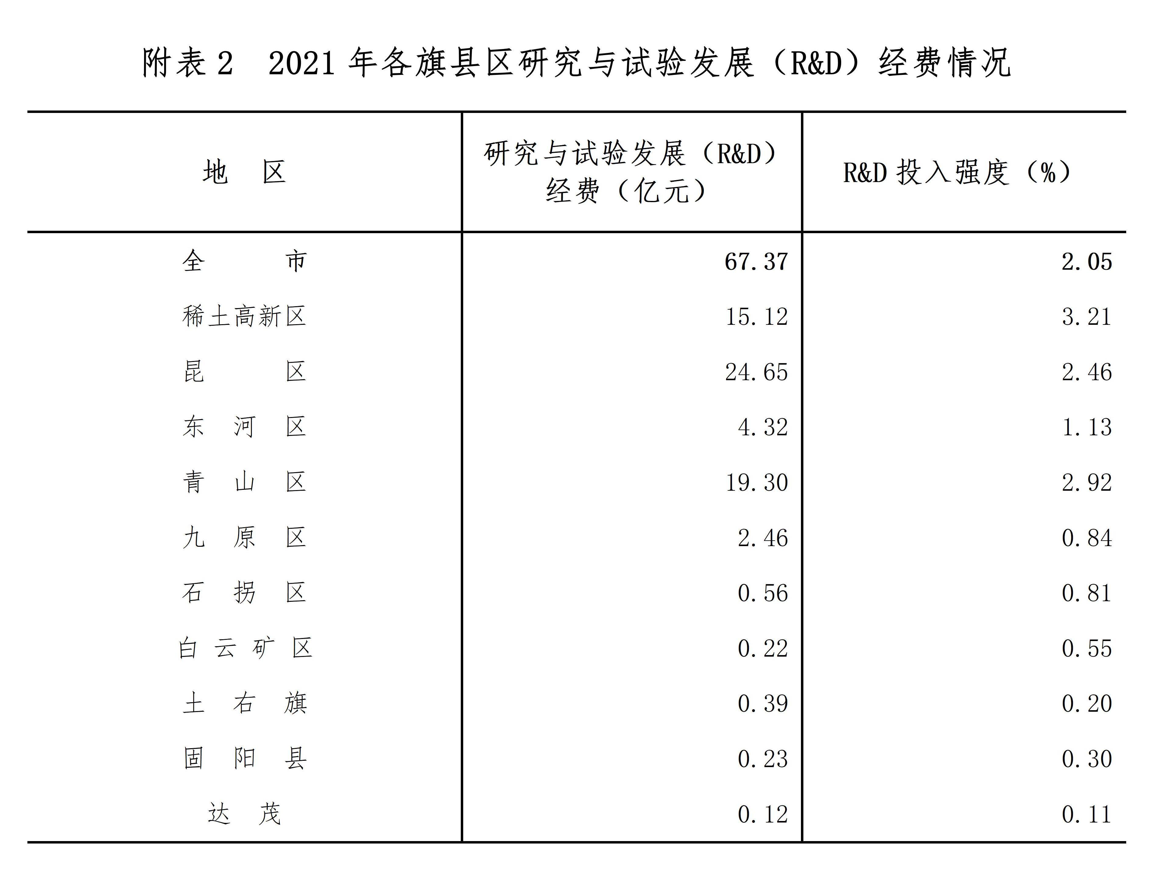 分地区看,研究与试验发展(R&D)经费超过10亿的旗县区分别是昆都仑区(24.65亿元)、青山区(19.30亿元)和稀土高新区(15.12亿元)。研究与试验发展(R&D)经费投入强度(与地区生产总值[5]之比)超过全市平均水平的地区有3个,分别为稀土高新区、青山区和昆都仑区(详见附表2)。