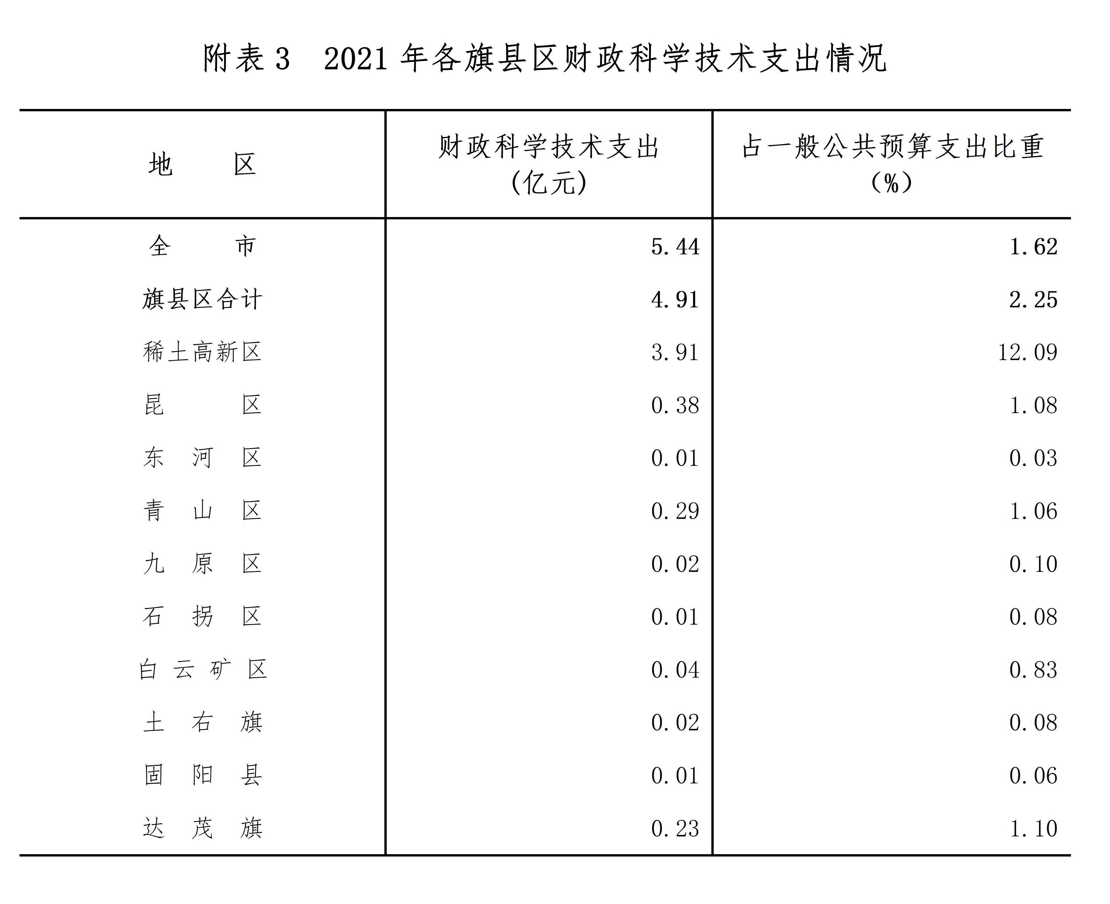 全市10个旗县区中,稀土高新区财政科学技术支出占一般公共预算支出比重高于全市平均水平(详见附表3)。